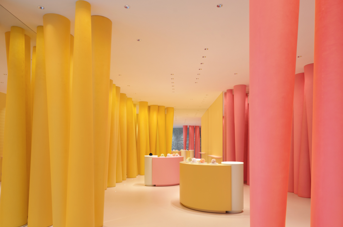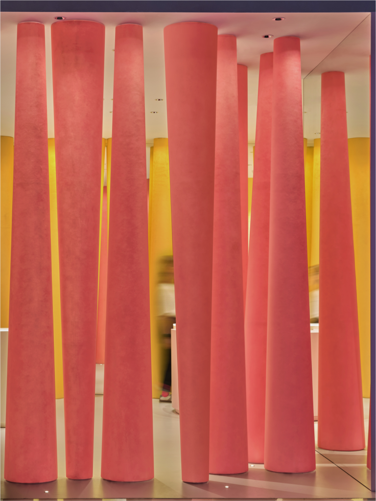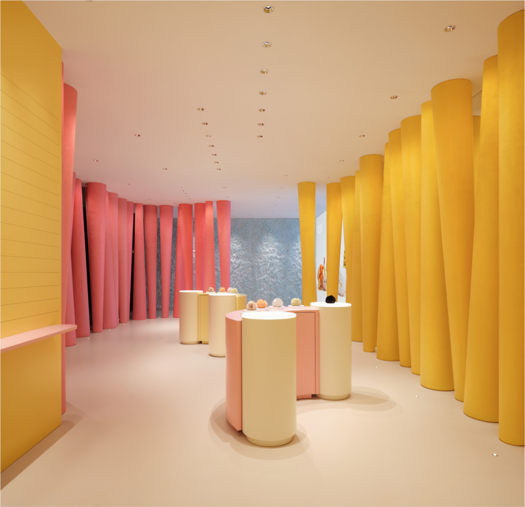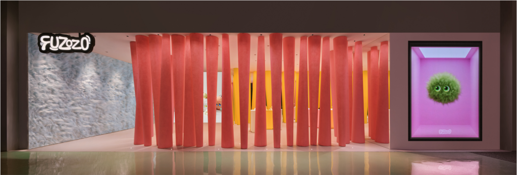 В результате получилось игривое и красочное пространство, ориентированное на поколение Z, особенно на девочек и девушек в возрасте от 5 до 30 лет. Концепция дизайна вдохновлена «лесом», с использованием стилизованных стволов деревьев, разделяющих торговое пространство. Эти стволы, изготовленные из стекловолокна, пропитанного смолой, имеют форму перевернутых конусов, создавая визуальную слоистость и причудливый эффект. В центре магазина расположены два изогнутых витринных стола с фигурками FUZOZO, привлекающие внимание посетителей. В дизайне преобладают розовый и желтый цвета, создающие атмосферу сновидения.
