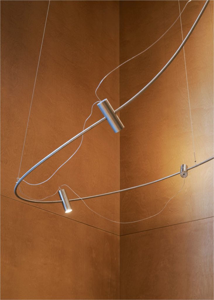 Освещение в магазине продумано до мелочей: на обоих этажах установлены регулируемые металлические потолочные светильники, а над прилавком парит оригинальное металлическое кольцо с направленными точечными светильниками.