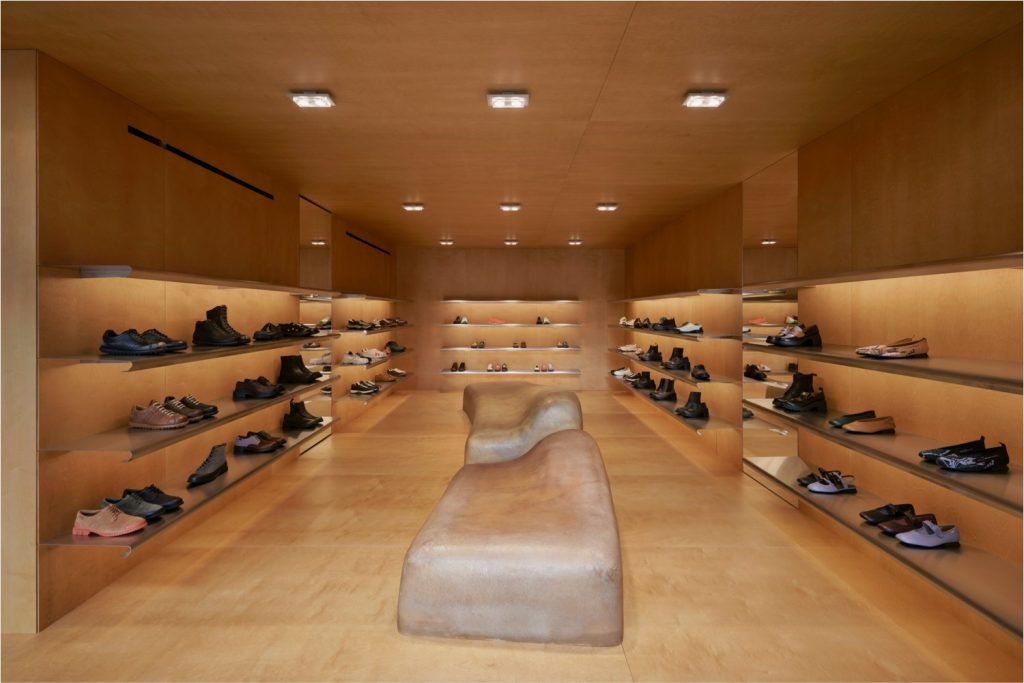 Просторный стеклянный фасад, как и прежде, приглашает заглянуть внутрь, где вас встречает завораживающее пространство, облицованное березовым шпоном. Этот натуральный материал покрывает пол, стены и даже потолок первого этажа, создавая ощущение единения с природой. Вытянутое помещение, напоминающее обувную коробку, по всему периметру украшено многоуровневыми стеллажами из нержавеющей стали с мягкой подсветкой.
